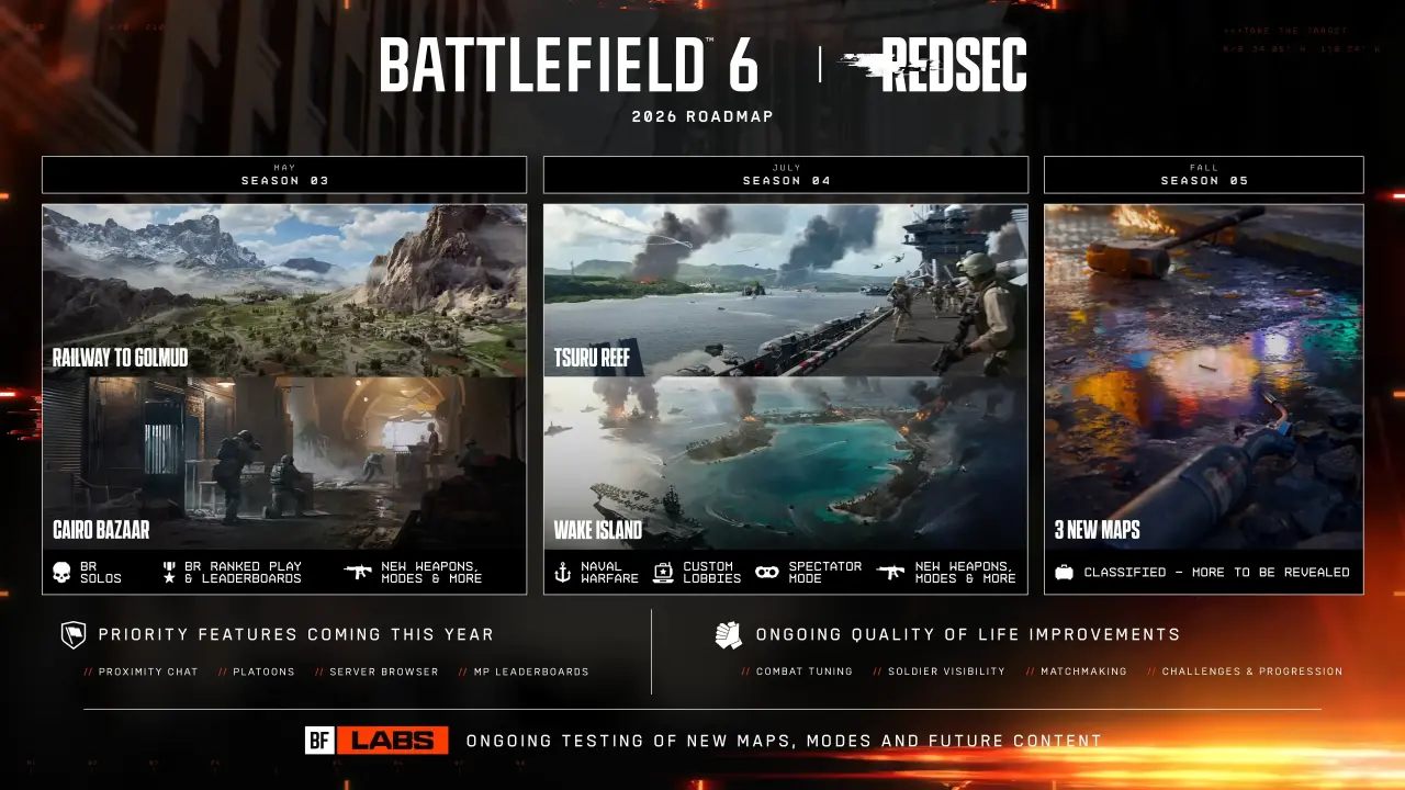 Treća sezona stiže u maju i fokusirana je na masivnost. Dobijamo Railway to Golmud, koji će po najavama biti najveća mapa do sada, idealna za ljubitelje tenkova i duge borbe. Za one koji više vole blisku borbu (CQC), stižu Cairo Bazaar arene. Ljubitelji Battle Royale moda REDSEC takođe dobijaju bitna ažuriranja: konačno stižu solo drops i dugo očekivani Ranked play, što će značajno podići takmičarski nivo igre.