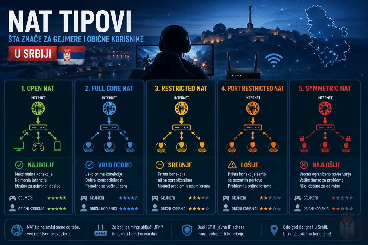 NAT (Network Address Translation) određuje način na koji vaš lokalni ruter upravlja dolaznim podacima sa interneta i usmerava ih ka vašem računaru. Razumevanje ovih tipova je ključno za optimizaciju mrežnog saobraćaja.