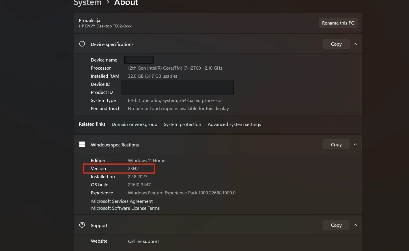 Da biste proverili svoju verziju operativnog sistema Windows 11, idite na Settings > Sistem > About i označite polje „Windows Specification“. Ako piše 21H2 ili 22H2, bolje je da se pripremite za ažuriranje da biste nastavili da dobijate kritična bezbednosna ažuriranja i poboljšanja kvaliteta usluge.