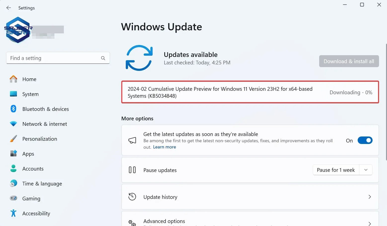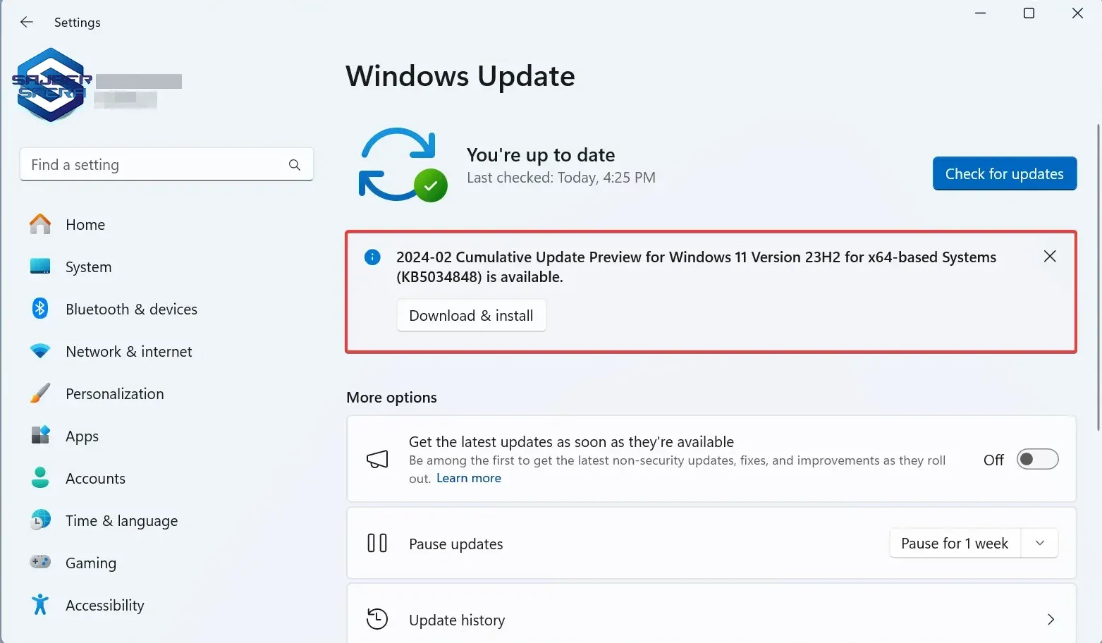 Otvorite Settings > Windows Update i proverite da li postoji poruka da je KB5034848 dostupna za preuzimanje. Kliknite na Download and install.